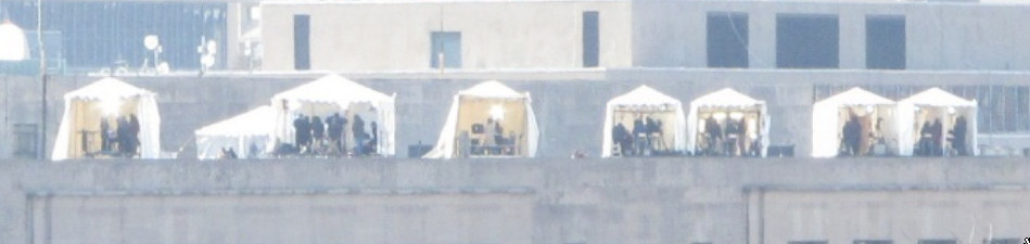 It was interesting to find the 4 police snipers on the building between the reporters’ scaffolding and the network camera tower. Also, on the roof a few buildings over are the cabanas of the network mucky mucks. I guess that’s where Katie Couric and Tom Browkaw and all them were.