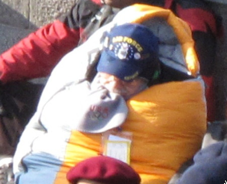 I see it as an orange sleeping bag. He’s a Tuskeegee Airman AND an Olympic Gold medalist (you can see both hats)! According to the snapshot viewer that’s