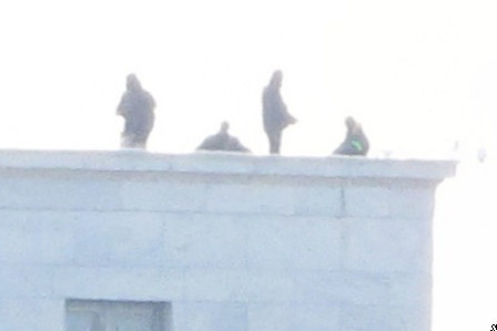 The building further to the right, with the weird dome on top is identified as the Canadian Embassy. There are tons of people standing on the roof, and more police above them.
