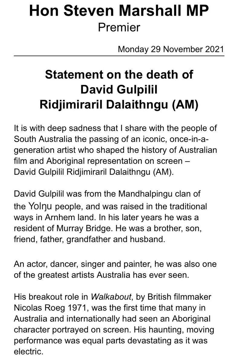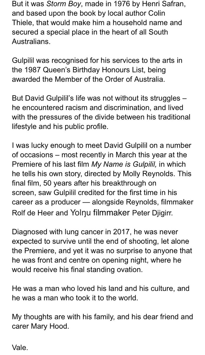 Australian actor David Gulpilil has died, at the age of 68. Film fans may know him from the Nicolas Roeg film Walkabout (also starring Jenny Agutter) or, where I know him best, the movie Storm Boy.