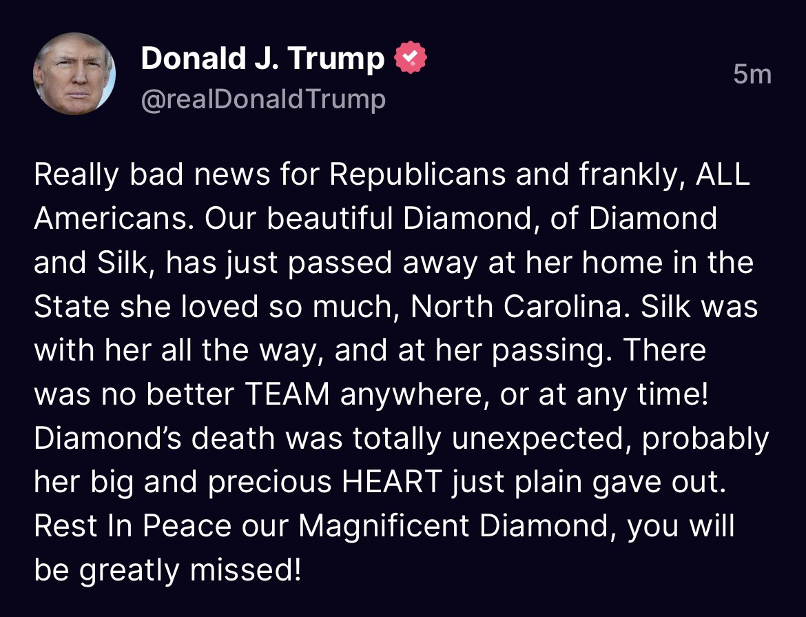 Donald Trump (gag) is reporting on Truth Social that Diamond of Diamond & Silk has died. I’ve seen no confirming news report, but a month ago it was reported that she’d been hospitalized with Covid. If true, it’s about 58 points (she was born in 1971).
