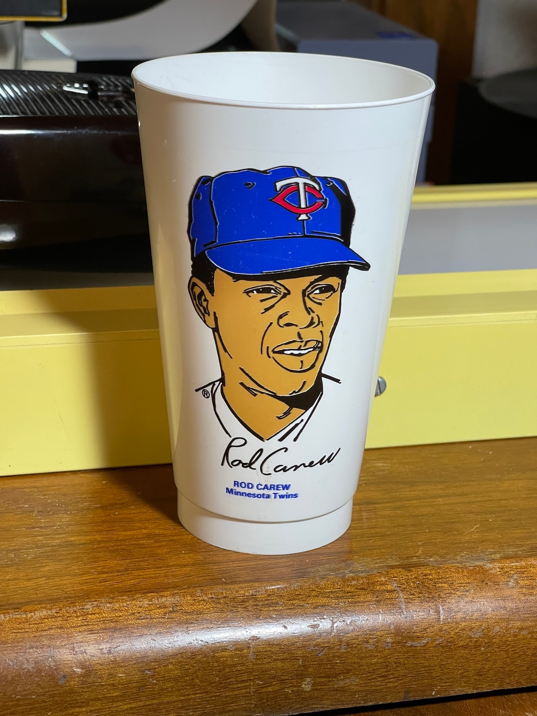 I had a couple of collectible Slurpee cups that I’d gotten at the 7-Eleven near our house in suburban Chicago, in '73 or '74. One was from a series of baseball players (Rod Carew); the other was from a series on endangered animals (the black-footed ferret). (Photos below are the actual designs, but not my cups.)