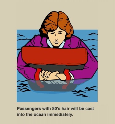 From an airliner safety card with humorously substituted text: Passengers with 80s hair will be cast into the ocean immediately
