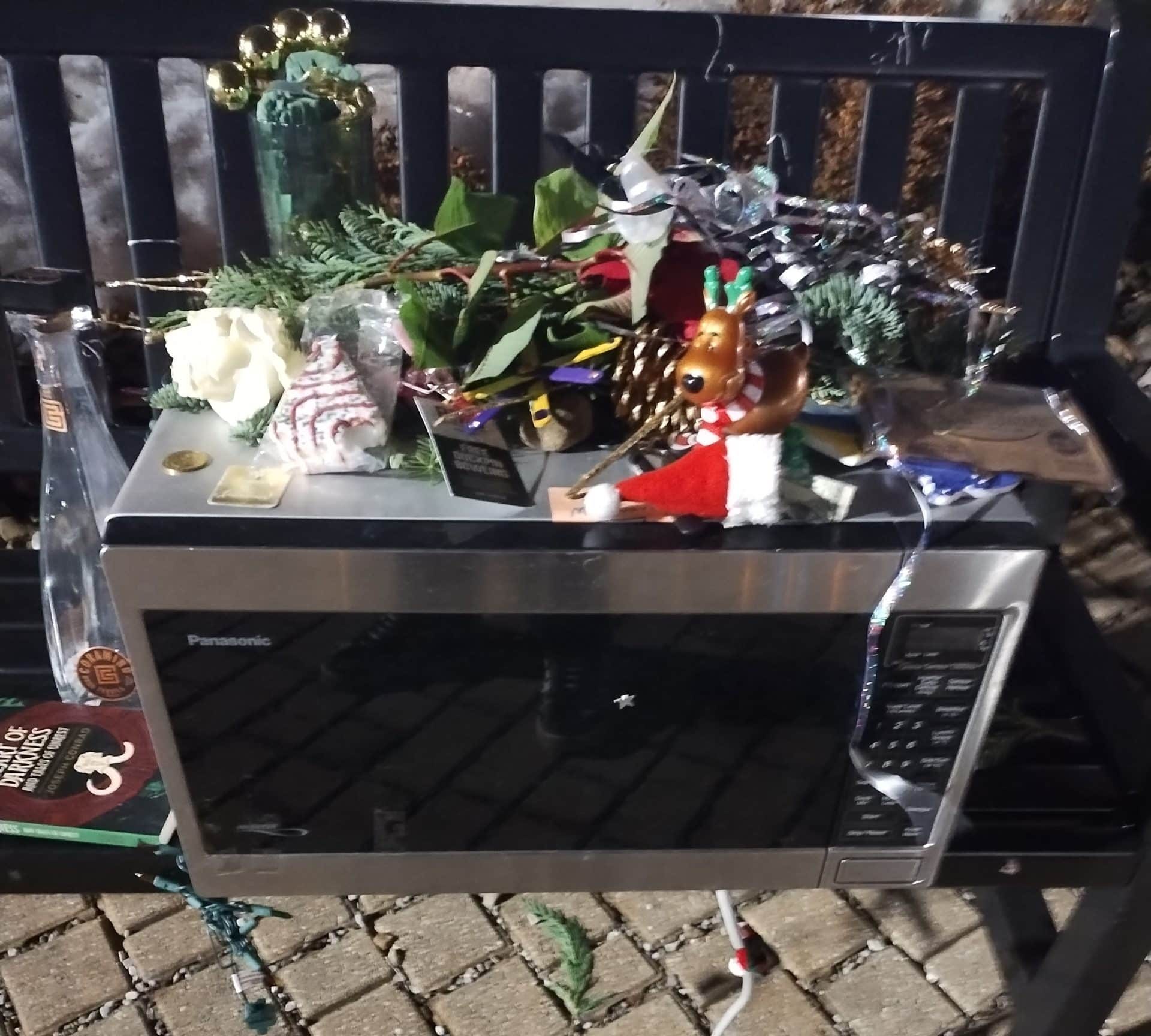 About 2 weeks ago on the r/Cleveland sub Reddit someone posted a photo of an abandoned microwave sitting forlornly on a park bench wondering why it was there. This was followed by Day 2, Day 3, etc. as the weather changed and it became covered in snow and then melted again. I guess some hints were given and soon other people found out where it was and the fun began. It started slowly with just a simple note left on it and then a Xmas ornament. In the time since then it has ballooned. People are finding it and making pilgrimages to the blursed microwave. They are photographed kneeling in honor of the sacred appliance. More and more items are being photographed and removed (I think). Now someone has setup an abandoned slow cooker. There have been paintings and sculptures made. It’s hilarious.