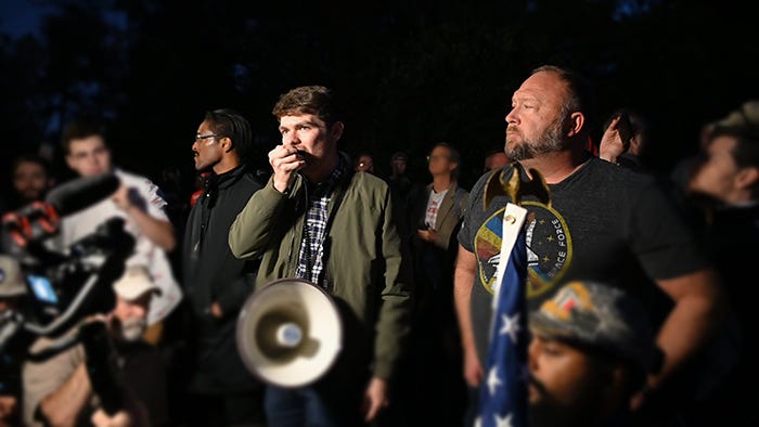 Also, this screen grab of a tweet from Nick Fuentes. He’s done nothing wrong! Poor him.