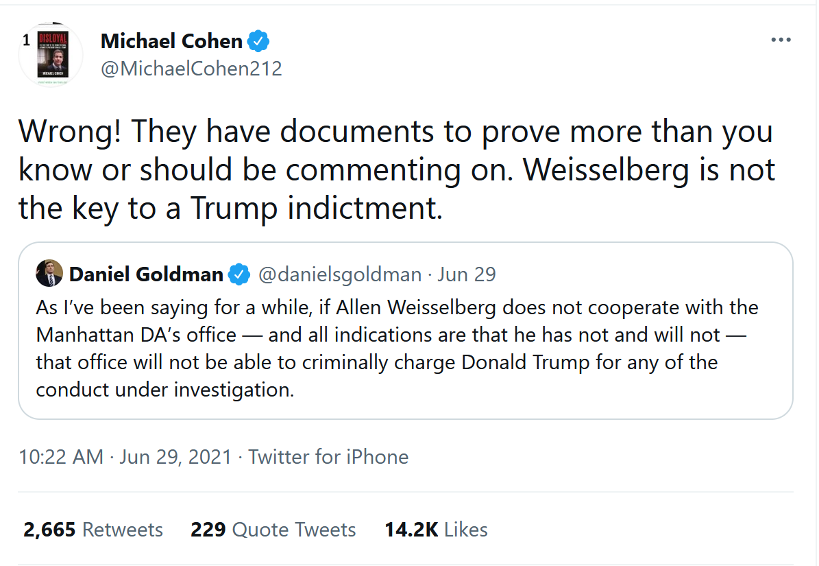 Cohen’s assertions about other documentation aside, it sounds like Goldman is saying that that he knows that evidence of criminal activity exists but as long as everyone stays quiet Trump will skate. Not exactly a claim of innocence.