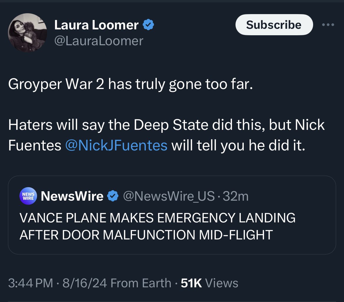 Laura Loomer is accusing Nick Fuentes of sabotaging JD Vance’s plane… is not a sentence I ever thought I’d have to type, but this is no longer a serious political party.