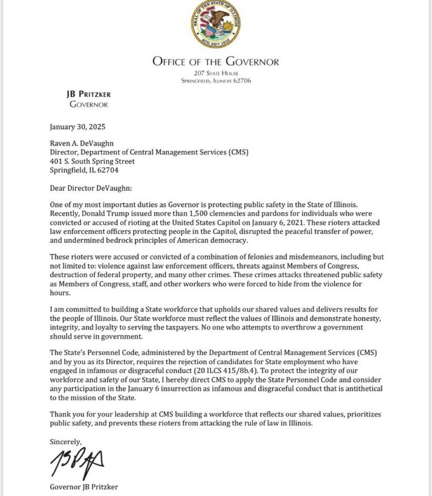 JB Pritzker has signed an order permanently banning 1/6 traitors from working for the state of Illinois in any capacity.