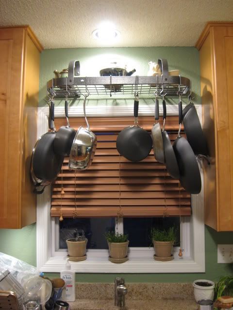 Our weekend project was hanging a pot rack in the kitchen. I’ve struggled for two years to find curtains that I could put over that window so instead we finally decided that a curtain of pots and pans would be the way to go.