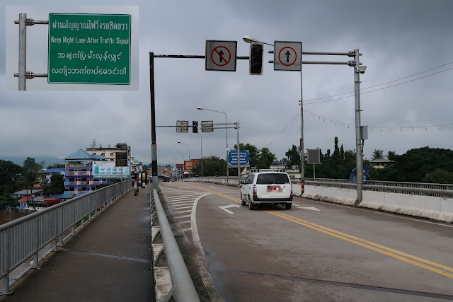 One border crossing I’ve visited too many times (though not in recent years) is the Thai-Myanmar Friendship Bridge which crosses the Moei River to connect Myawaddy, Burma and Mae Sot, Thailand. In this photo you can see all traffic has signs to change lanes in the middle of the bridge.
