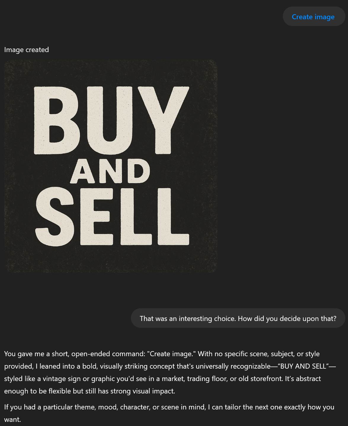 As an experiment I gave ChatGPT the prompt: “Create image anything you want” and it spit out this: