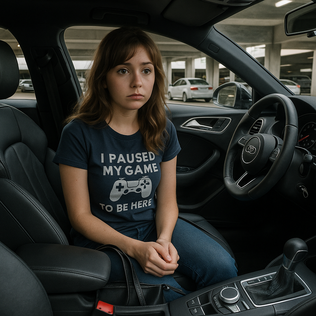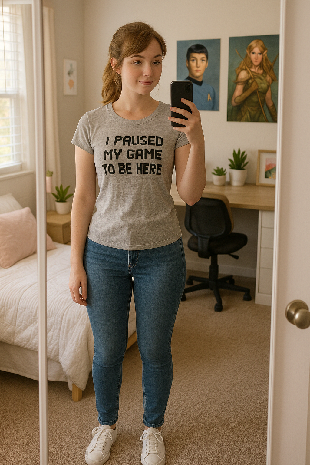 Context: An attempt to illustrate a roleplay story scene. That slogan had been on the shirt she’d worn yesterday, which the AI had invented. In my prompt, I’d told the AI the character was picking something different to wear today to the new job, without being specific enough, I guess.