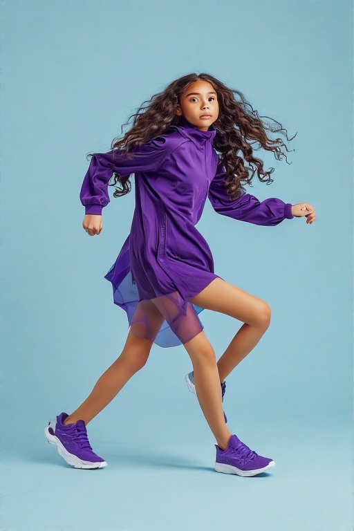 Prompt: running 12-year-old girl, long wavy hair, dark purple modern trendy dress, dark purple matching shoes