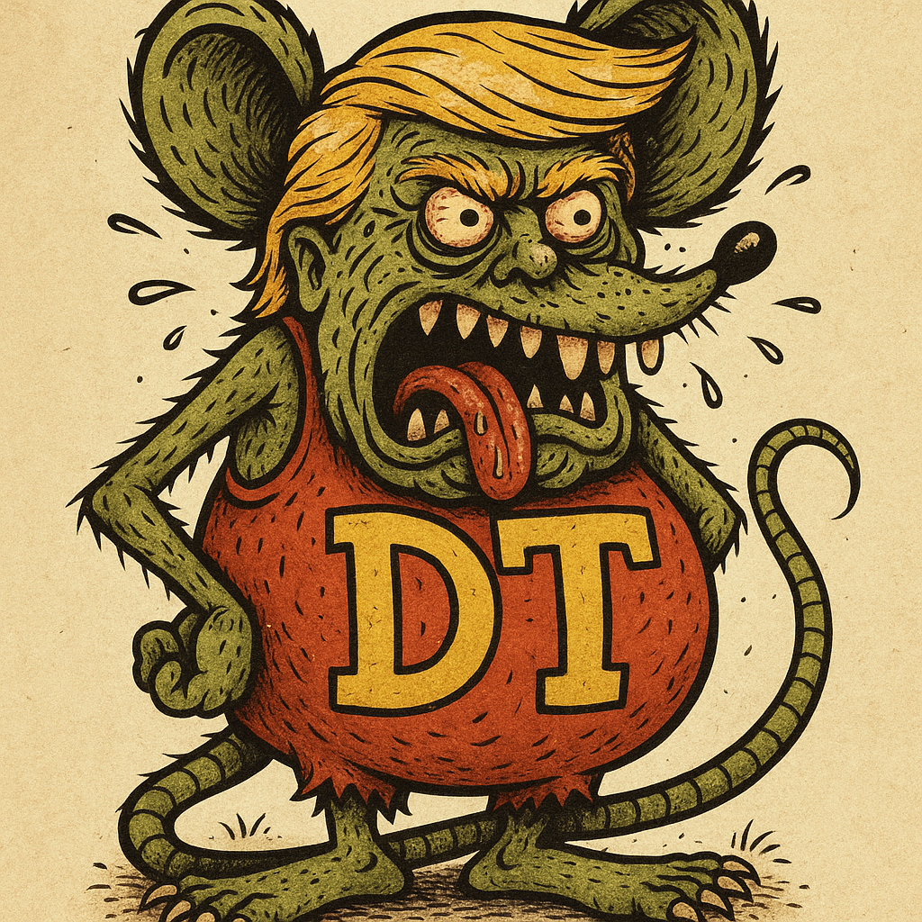 Make an image of a blend of Donald Trump and Rat Fink, put the initials “DT” on his belly (Not “RF”)