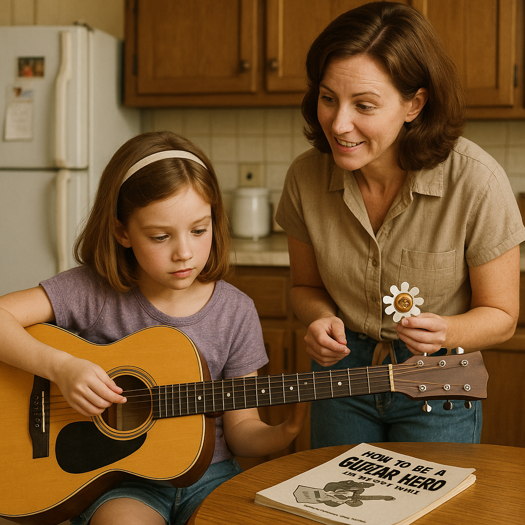 Context, scene set in 1977. Mom showing her 10-year-old daughter her old guitar and lesson book. The flower thing is supposed to be a tuning aid. I’m wondering if the shirt the girl is wearing might be anachronistic.
