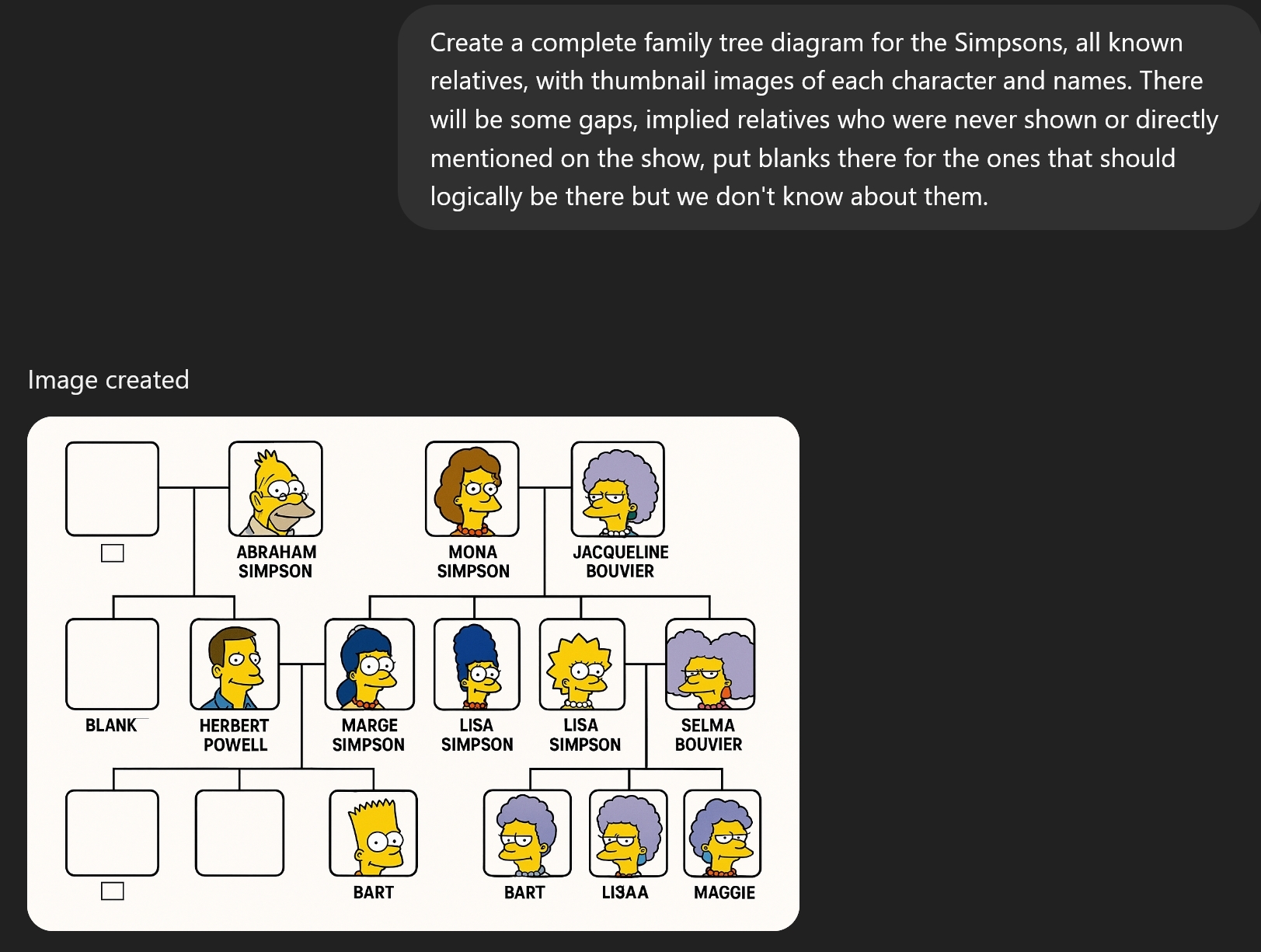 I’d also expect a Simpsons family tree to include the aunts. Though that would necessitate some blank spots on the tree, since I think they’re Marge’s sisters, but we don’t know Marge’s parents.