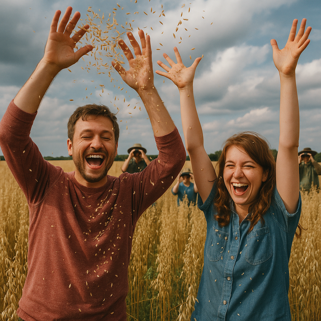 Two people having a whole lot of fun with oats. Iphone 15 photo with shallow dof and forced perspective. 9:16