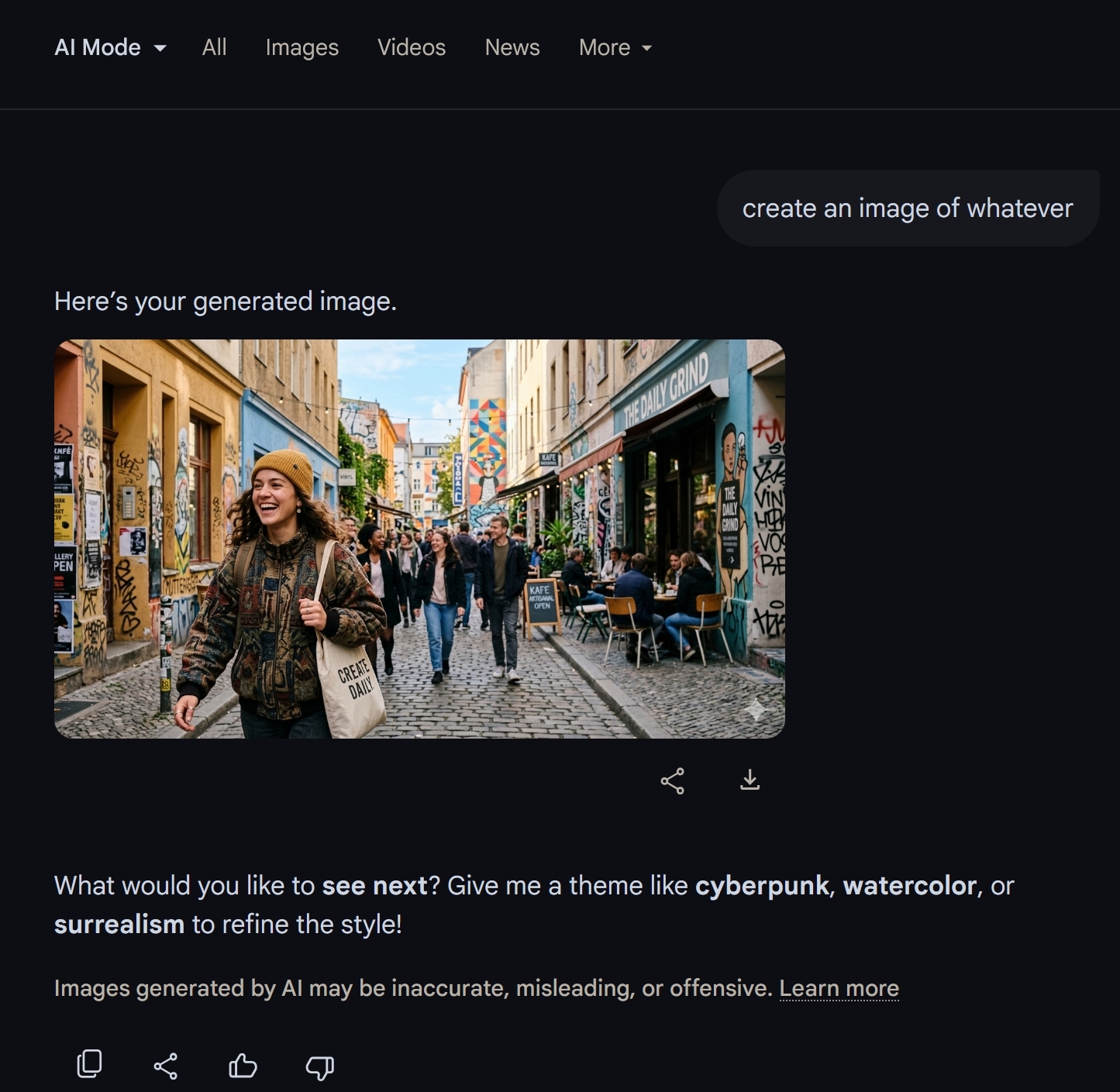 It looks like maybe Google changed the way AI mode works overnight since I made my last post? It took more steps to get that image, and so far it hasn’t done an AI summary at the top of a few test searches. Maybe they’ve made it less intrusive?