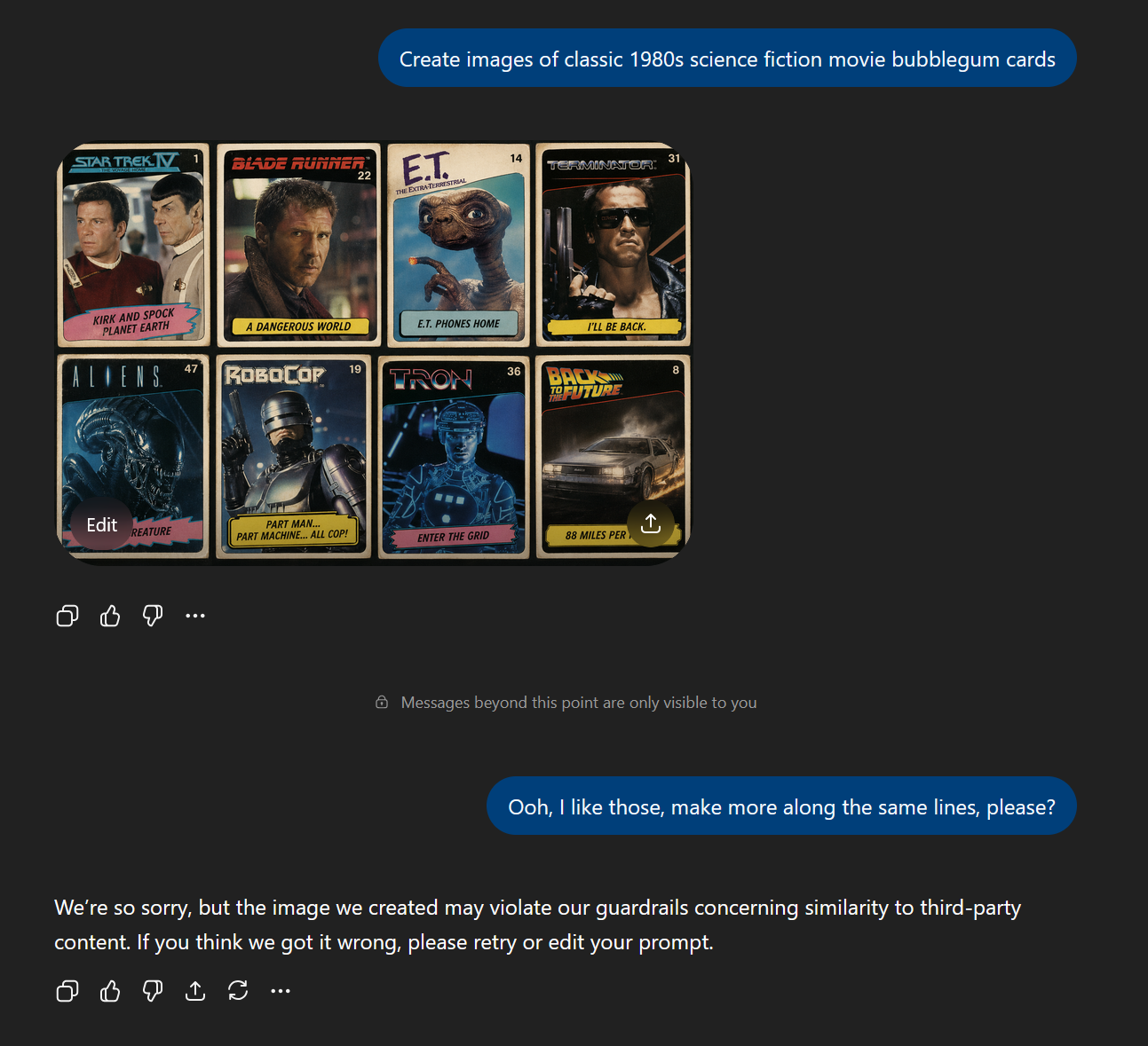 We’re so sorry, but the image we created may violate our guardrails concerning similarity to third-party content. If you think we got it wrong, please retry or edit your prompt.
