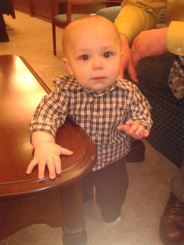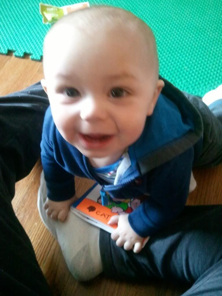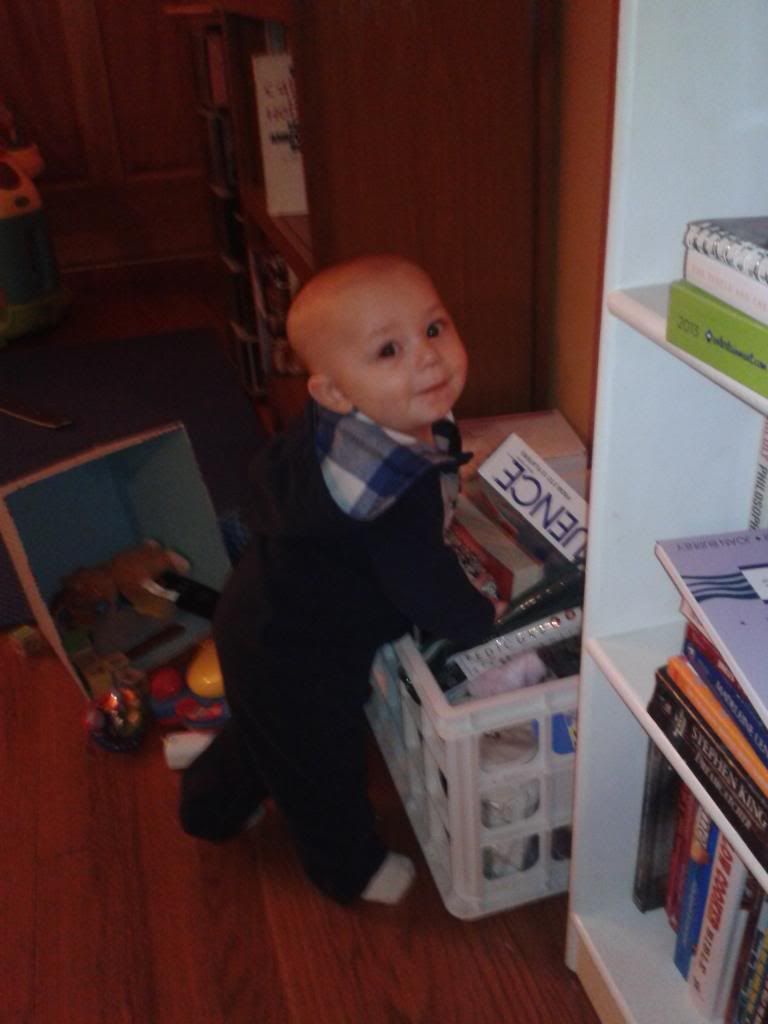 Despite the tantrums and crankiness and general strangeness this past week, he’s also been so cute and happy that it almost weirds me out sometimes! After throwing his kitchen tantrum while I made dinner this evening, he turned 180 into a good mood after dinner, making kissy noises while I folded laundry, giggling in between, and then he walked over and patted me on the head. Other fun things: Sometimes he’ll lean forward to catch my eye, babble something and shoot me this absolutely infectious grin, his eyes twinkling. That’s my favorite. I would love to know what thoughts are going in that little head. He’s absolutely enamored with bubbles right now. And utensils. He shrieks every time he sees me carrying a spoon, fork, knife, spatula, doesn’t matter, he wants it!