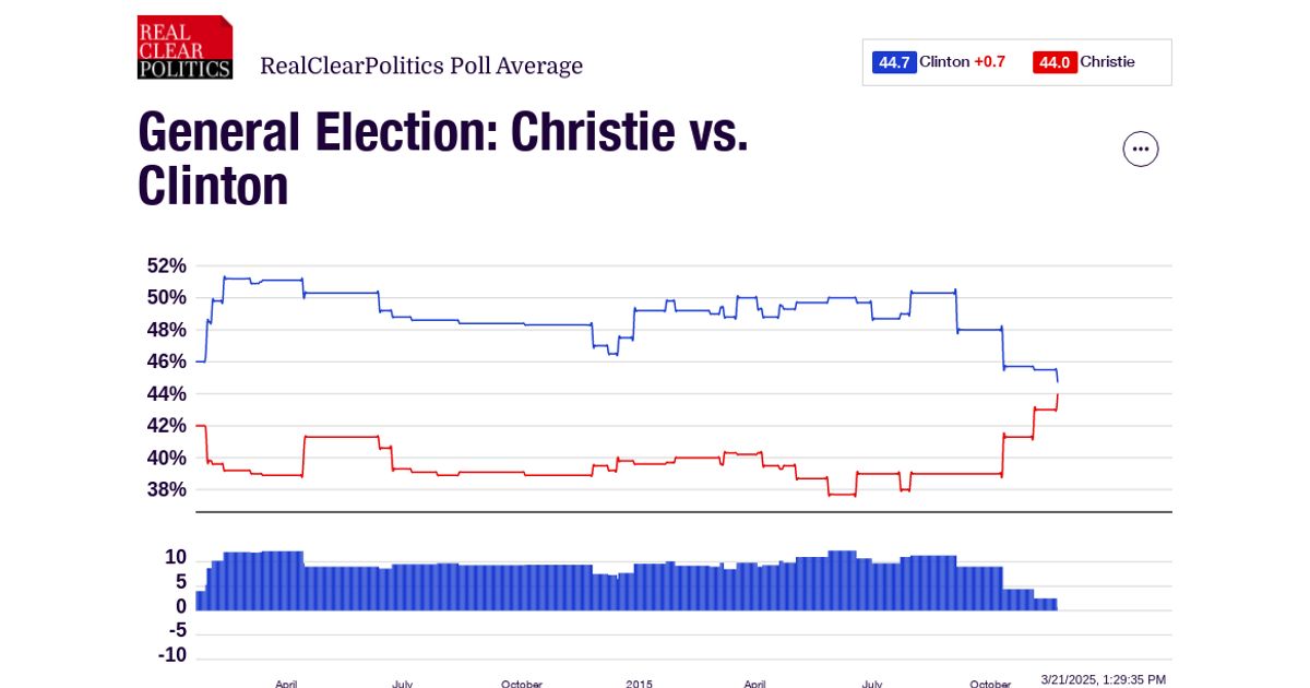 Again, Christie will have to pass the extreme conservative gauntlet in the primaries, I still see a planned reduction on his polling advantage once he has to burn any moderate positions that he could use later in the presidential contest.
