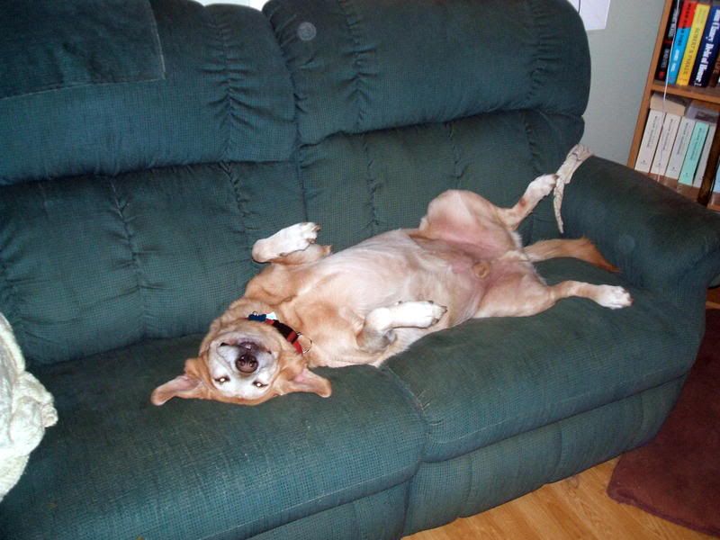 Tomorrow a charity is coming by to pick up our recliner loveseat, which will be replaced by the new recliner chair that will also be delivered tomorrow. That recliner loveseat has been Isaac’s favorite place to sleep at night for several years now. So after we pushed it out the front door to get picked up in the a.m., Isaac got off his dog bed in the corner, stopped and gave Papa Tigs a Look, and then heaved a big sigh and flopped down on the floor. Hee!