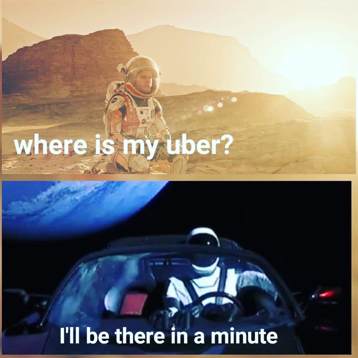Oh good grief, it’s a jpeg and sfw. Fine, if you want the joke spoiled, it’s A conflation of “The Martian” and Falcon Heavy’s Starman