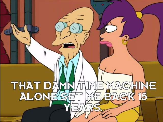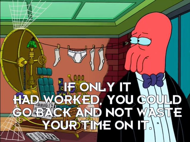 Bah! If I wanted to do work, I wouldn’t have spent years of my life designing and building this damn time machine!