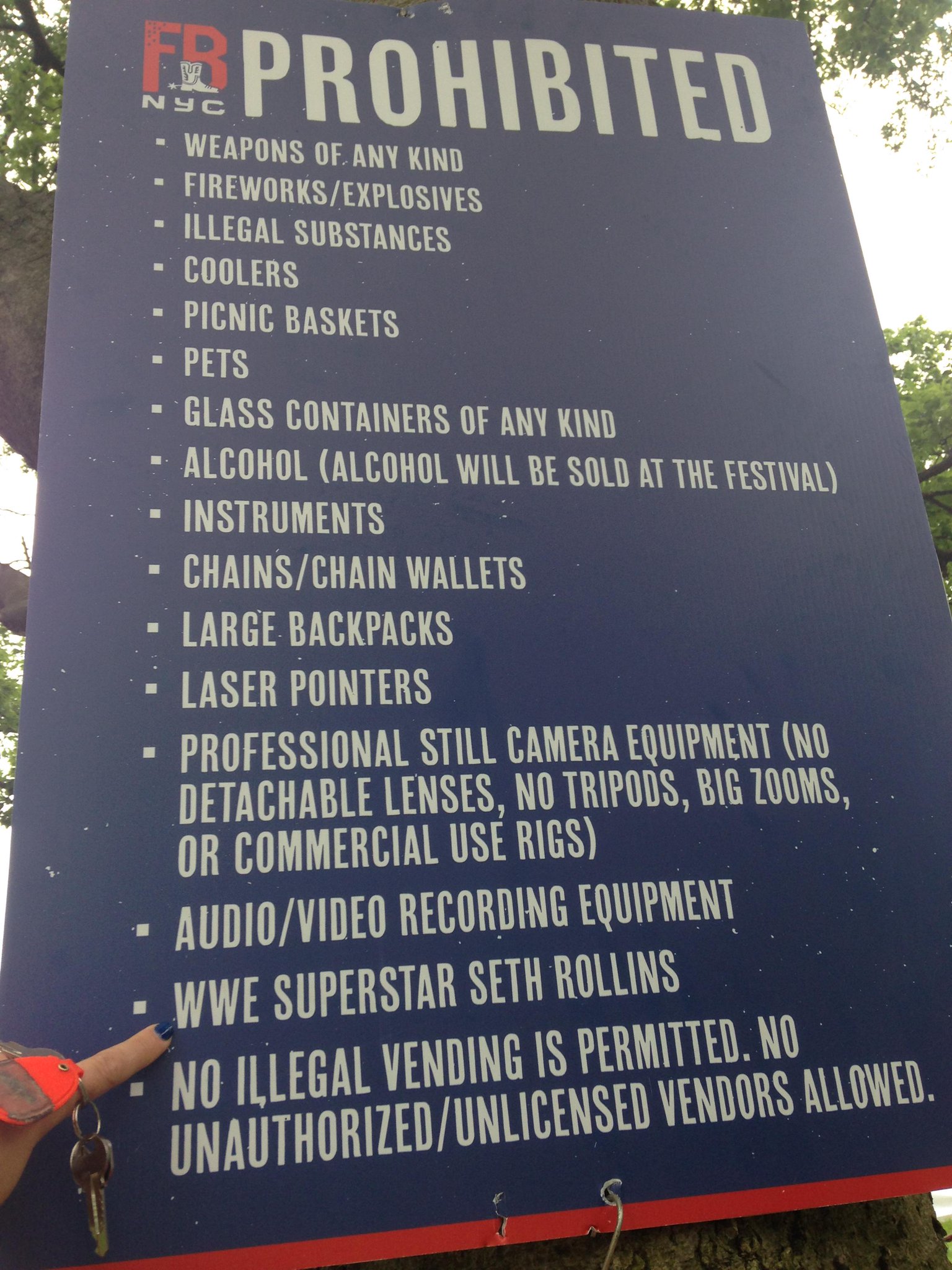That Seth Rollins ban is so random. I wonder if WWE’s going to incorporate it into RAW tonight? Have him show up to the festival with J & J & Kane, expect to be given VIP treatment, then have a hissyfit when somebody points out that line on the sign.