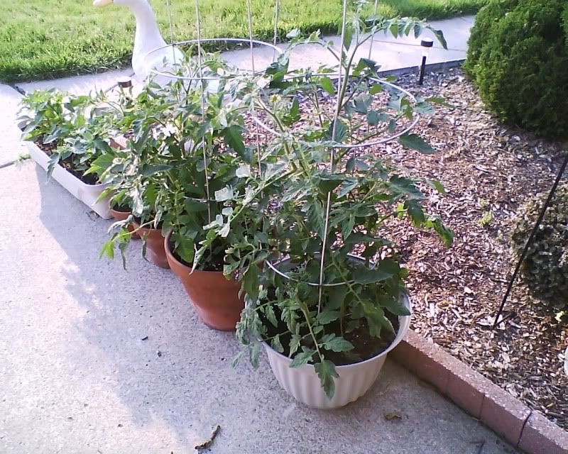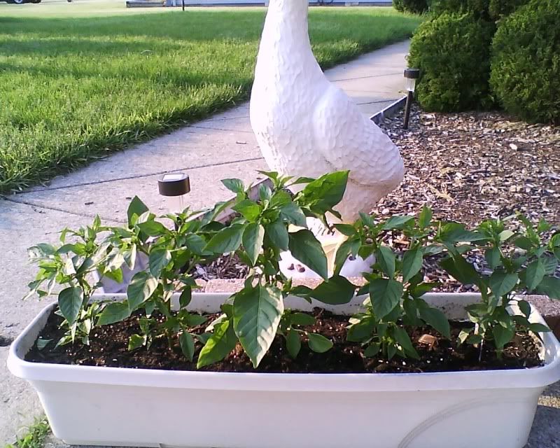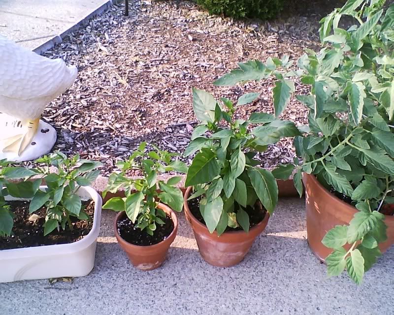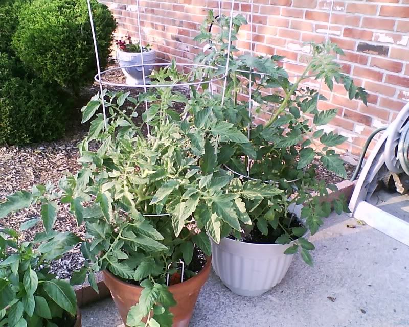 Here’s an update on my planter garden, with pictures. I planted these at the beginning of May as seedlings from local greenhouses and I have done nothing but water them, and taken the advice here not to add any more fertilizer to the miracle gro potting soil. Although, I am thinking about giving them some fish emulsion when they start to bear fruit.