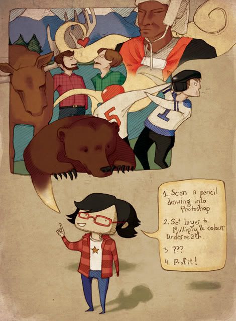 The only comment I can ever think of getting, that was somewhat negative, was when I was told (by several different people) that all the “realistic” looking characters that I try to draw are basically just slightly modified and simplified versions of myself, including my body shape and my face and hair. Now that I think about it, it’s true, goddammit. I never try drawing faces other than the same one over and over again, unless I’m trying to do really stylized and ridiculous looking ones like the ones on the “Workmen.” Another flaw of not “drawing from life,” I guess. I’ve tried drawing other people but I’ve never finished because I always think that it doesn’t look like them, and that they won’t like the drawing, and I just give up.