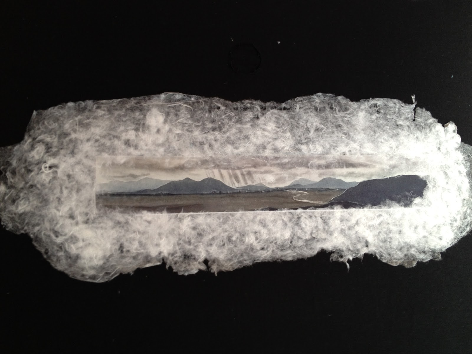 This is an unusual piece by Sarah Brayer. The scene is a street somewhere in a Japanese village, where it’s snowing. The print is attached to the back of a larger piece of handmade white paper that gives the impression of a cloud, in that the edges are not defined. Somewhat similar to this piece by her, but not so rectangular.
