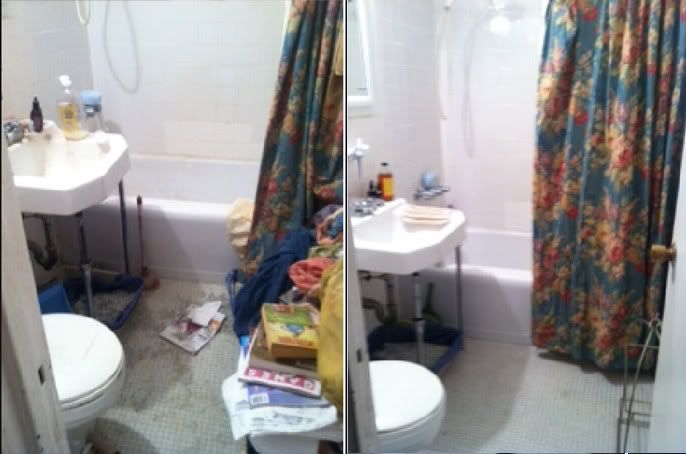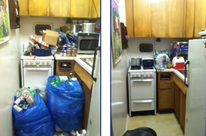 The Kitchen (That “before” photo reveals the answer to the recycling debate! Also I wish you could see the floor in the ‘before’ picture, because it was just sinfully gross. Now it’s… well, the tiles still suck, and it still bugs me that they weren’t attended to before I moved in, but they’re as good-looking and, most importantly, clean, as they’re gonna get. You also can’t see this but Sol cleaned the insides of all the appliances, including the toaster and microwave, and my barely-used George Foreman grill!)