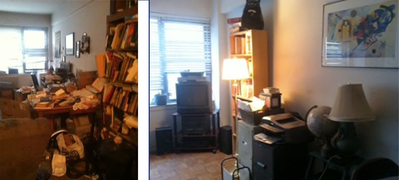 I had been slowly working on my office/guest room/exercise room, Getting rid of at least 10 pieces of paper (from old files, or from boxes that just went from move to move, unlooked at) a day, a book a day, a cd or dvd a day. Yes, it’s a glacial pace, but it does ad up.