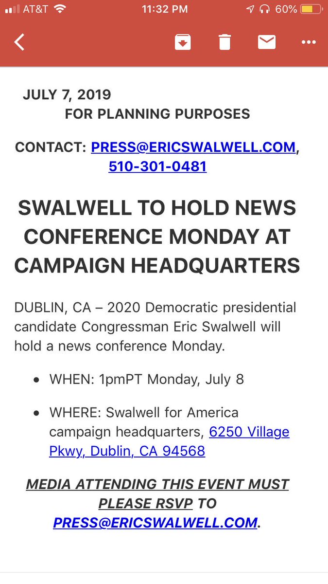 It could be as early as today, according to Twitter, Eric Swalwell has canceled a trip to New Hampshire and is holding a press conference today.