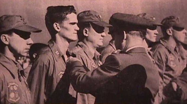 The crew was awarded medals by Curtis Lemay. In this picture, he is the guy in the middle, to the left of the guy getting the medal.