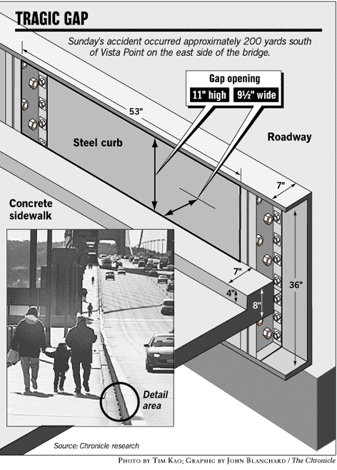 Later, the GG Bridge corrected the hazard with a sturdy, taught cable that essentially split the gap in half — now there are two 4¾” gaps separated by that cable, instead of one 9½” gap. Much safer.
