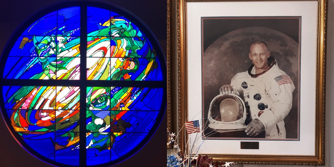 In Webster TX, the communion kit he used is displayed in the lobby of his former church. And the stained glass windows of that church have some moon rocks embedded in them (okay, body, maybe tiny pebbles). That’s the Presbyterian Church there in Webster.