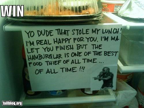 I think on “Passive Aggressive Notes” someone photographed a note on a door that said something like “To whoever is stealing my food: I have three containers in the fridge, I peed in one of them, I’m not telling you which one.”