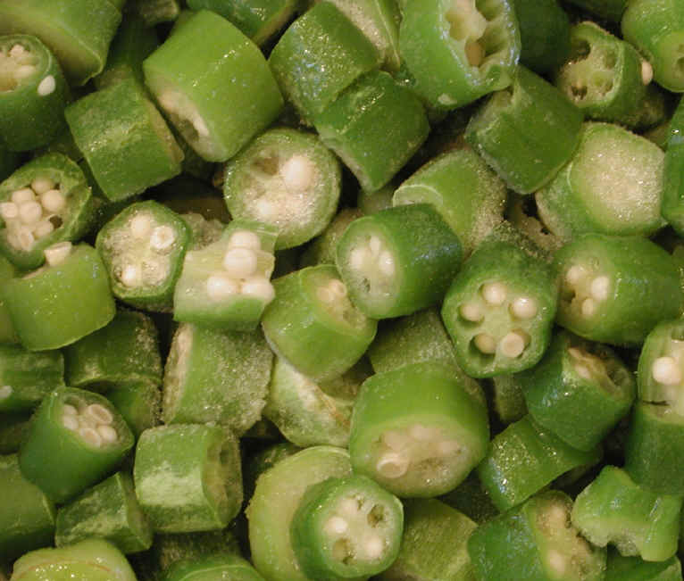 So be warned: They’re slimy! Those hollow chambers you see in the cut-up okra (where the seeds are) are filled with some kind of thick juice that oozes out. The stuff is utterly grossly gooey and slimy, perhaps being more useful as a water-based lubricant for biological activities other than eating.