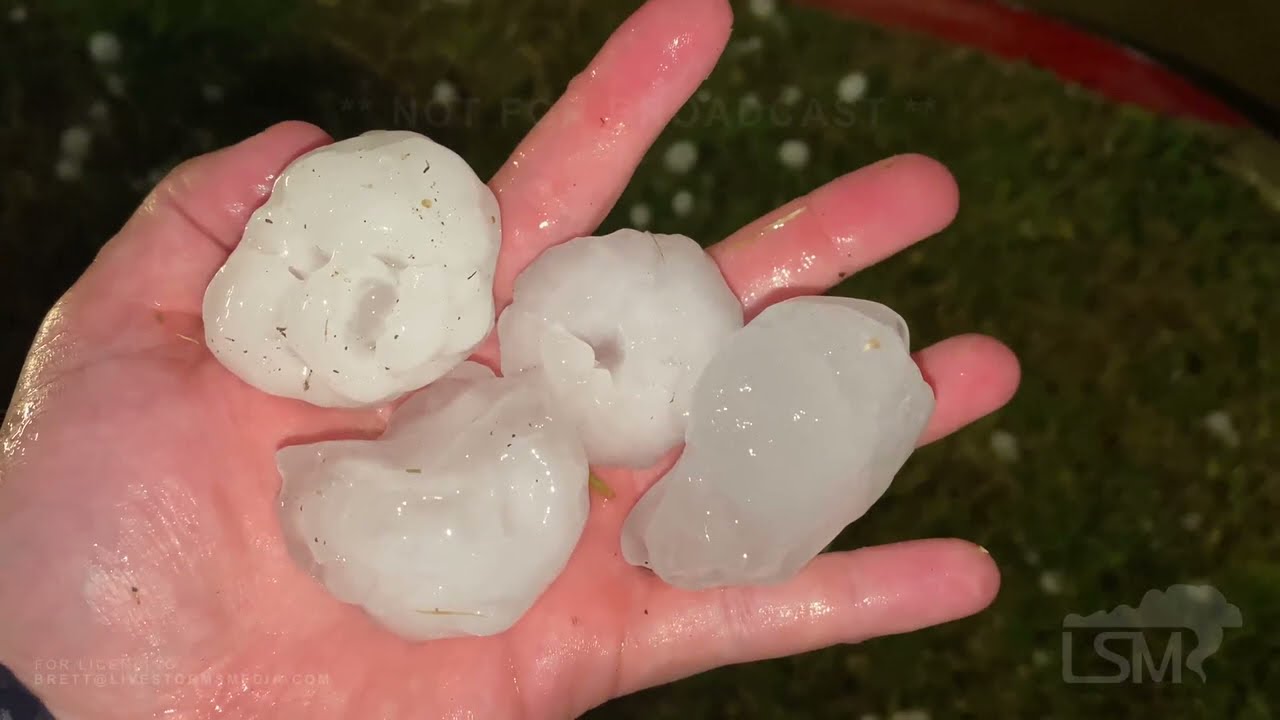 There were verified claims of 6 inches across, according to the news, but most were golfball sized with a few baseball-sized.  Winds were over 80 mph and (IIRC) there were more than 32,000 insurance claims from that particular storm.   I don’t recall many injuries though – I think most around here take hail very seriously and get to shelter.