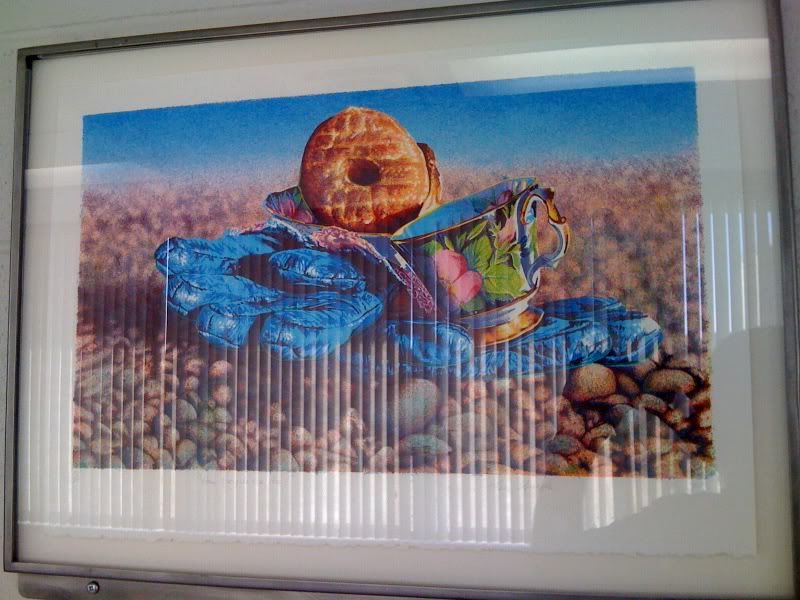 Very Canadian. Very Albertan. Rocky landscape, brilliant blue sky, warm gloves, teacups, a babushka or a silky scarf, and of course featured prominantly a glazed doughnut. I smile a little every time I walk by it.