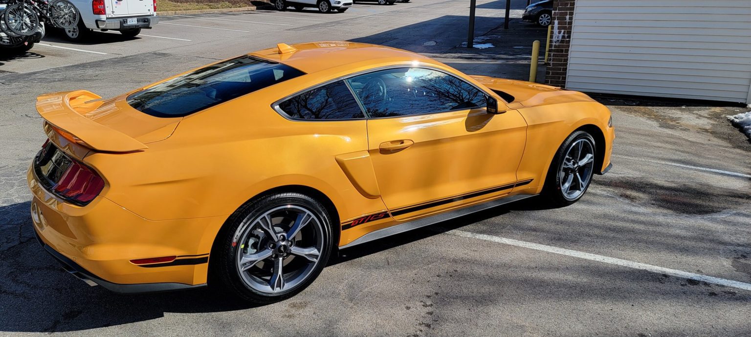 Ford has been offering some brights recently. The front car below is what Ford calls Yellow Peel, and the one behind it is Grabber Lime. These are/were stock colors for Mustangs in recent years (unsure for 2022 models).