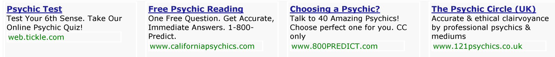 Yes, this is a hijack, but y’all just gotta see the ads that appeared below this thread. All four are for psychics or psychic services. Why do I get the feeling that we are losing the battle?