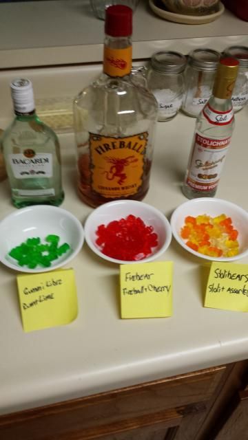 Gummi bears soaked in booze And congrats on beaking 100. I did it once.