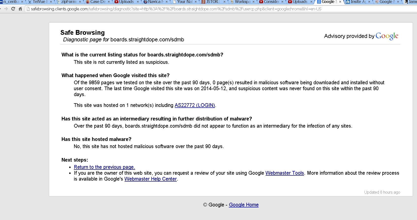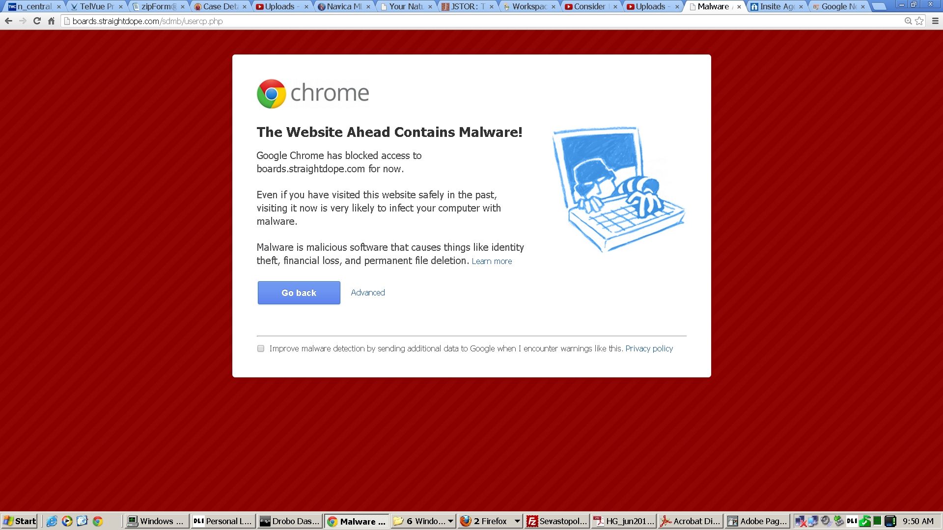 There is an issue most likely with the banner ads causing Google to flag the SDMB as an attack site. Many of you using Chrome, Firefox, or Safari are receiving warning pages in your browser when you attempt to navigate to the site.