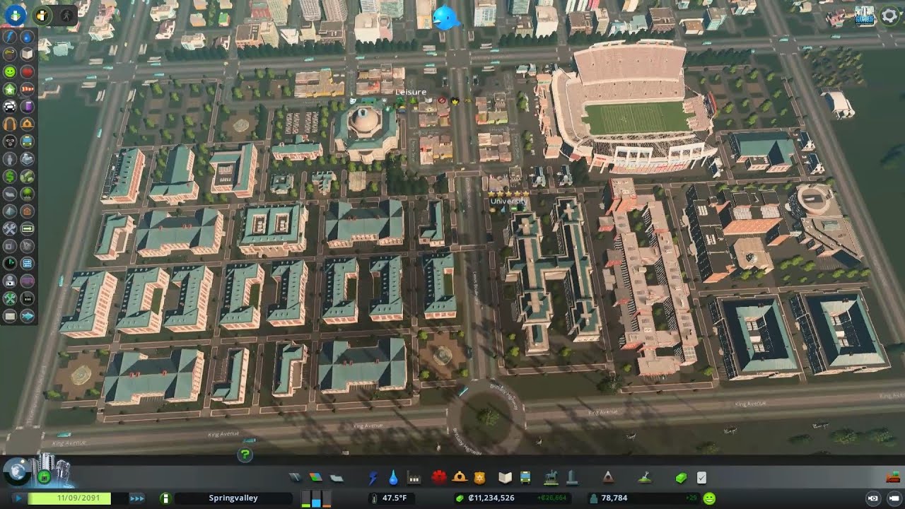 Yesterday devolved into the Campus Decade for my city, in that I figured out how to max out a campus area but it took 8 game years to do it. The whole time I was getting progressively more annoyed at how expensive it was ($45k per week, for years!) but then in the end it snapped back to moderately profitable: My finished campus area costs $68k/week but generates $70k/week in tuition, for a net profit around $1600. Meh.
