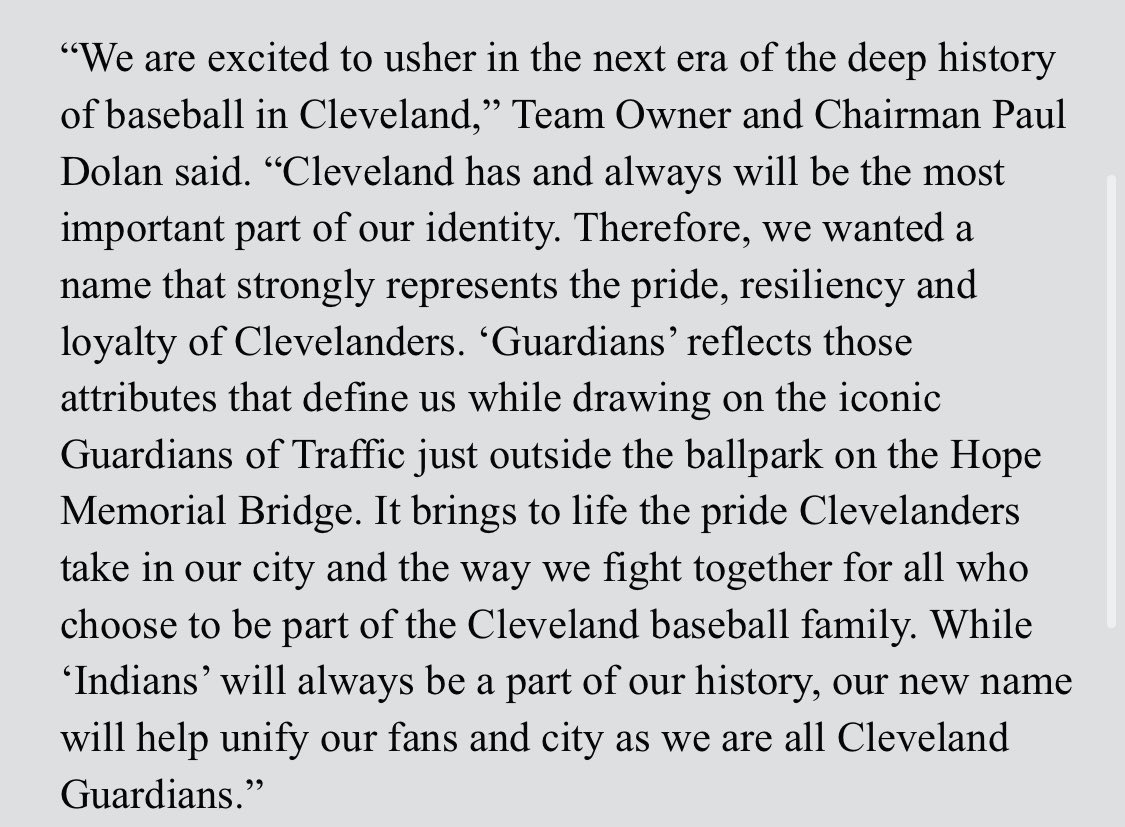 The new Cleveland name is supposed to honor the Guardians of Traffic statues adorning entry to the Hope Memorial Bridge. From Wikipedia: