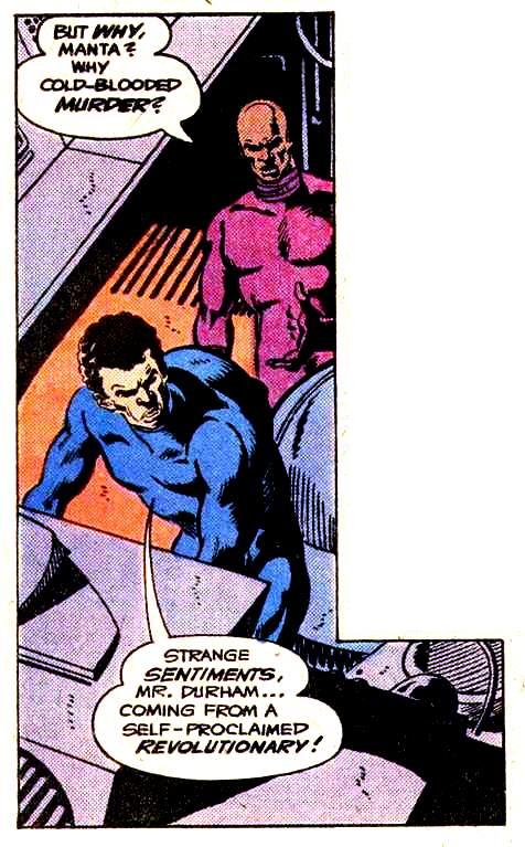 When Black Manta first appeared in the 1960s, he was a pretty generic villain, and nobody knew what he looked like under the mask. In the 1970s, he became a militant black nationalist, and when he took off the helmet, he looked sort of like Stokely Carmichael. (This was the best picture I could find of helmetless Manta. Sorry.)