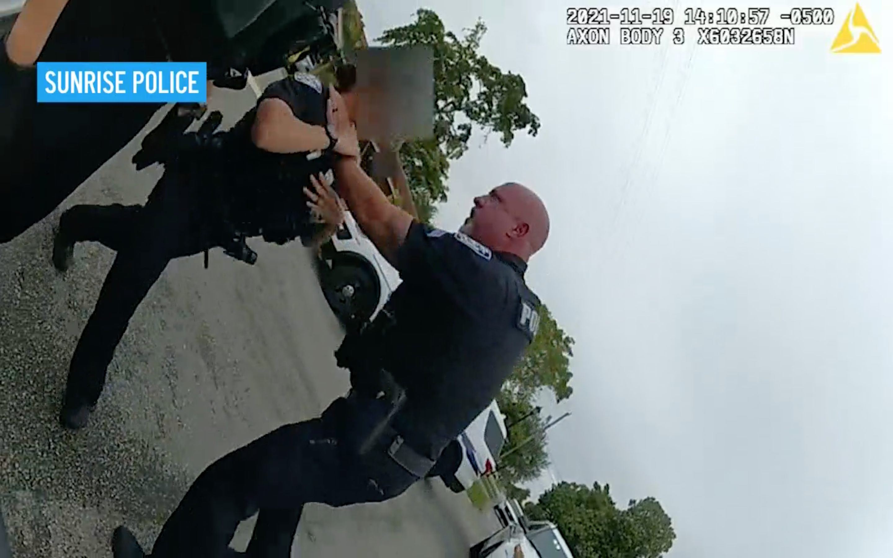 This one is cop on cop. A police sergeant in Sunrise, Florida was looming over a suspect already in custody with a pepper spray, a female officer grabbed the sergeant and pulled him away, and the sergeant grabbed her by the throat and shoved her against a car.
